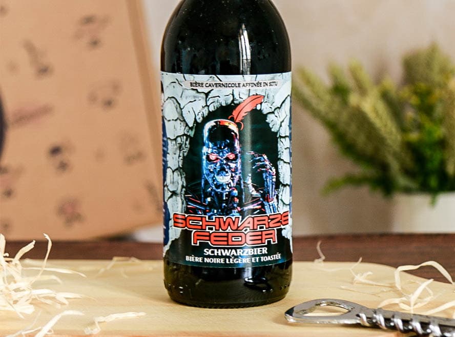 Bière noire Schwarze Feder, légère saveur toastée avec des arômes de fruits secs. Avec une saveur originale, elle se déguste entre amis ou en famille avec un dessert au chocolat. Teneur en alcool: 4,6%.